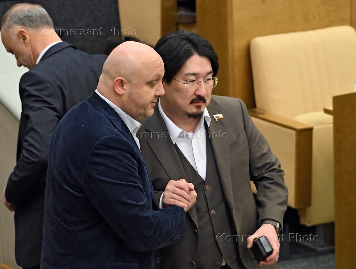 Пленарное заседание Государственной думы (ГД) России. Член комитета ГД России по энергетике Муслим Татриев (в центре) и председатель комитета ГД России по охране здоровья Бадма Башанкаев (справа) во время заседания.