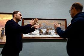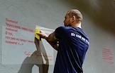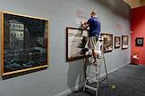 Пресс-показ выставки "Помним!", посвященной 80-летию полного освобождения Ленинграда от фашистской блокады. Сотрудник готовит экспозицию к церемонии открытия.