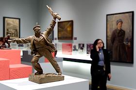 Пресс-показ выставки "Помним!", посвященной 80-летию полного освобождения Ленинграда от фашистской блокады. Жанровая фотография. Посетительница снимает экспонат на камеру мобильного телефона.