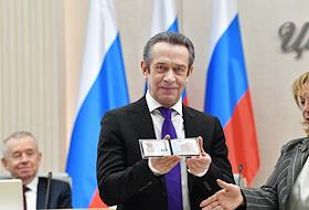 Заседание Центральной избирательной комиссии (ЦИК) России по вопросу регистрации самовыдвиженца и действующего президента России Владимира Путина кандидатом на выборах президента России. Председатель ЦИК России Элла Памфилова (справа) и сопредседатель избирательного штаба кандидата на должность президента России Владимира Путина, председатель Союза театральных деятелей России, художественный руководитель Московского театра Олега Табакова Владимир Машков (слева) с удостоверением кандидата на выборах президента России Владимира Путина, на заседании ЦИК России.