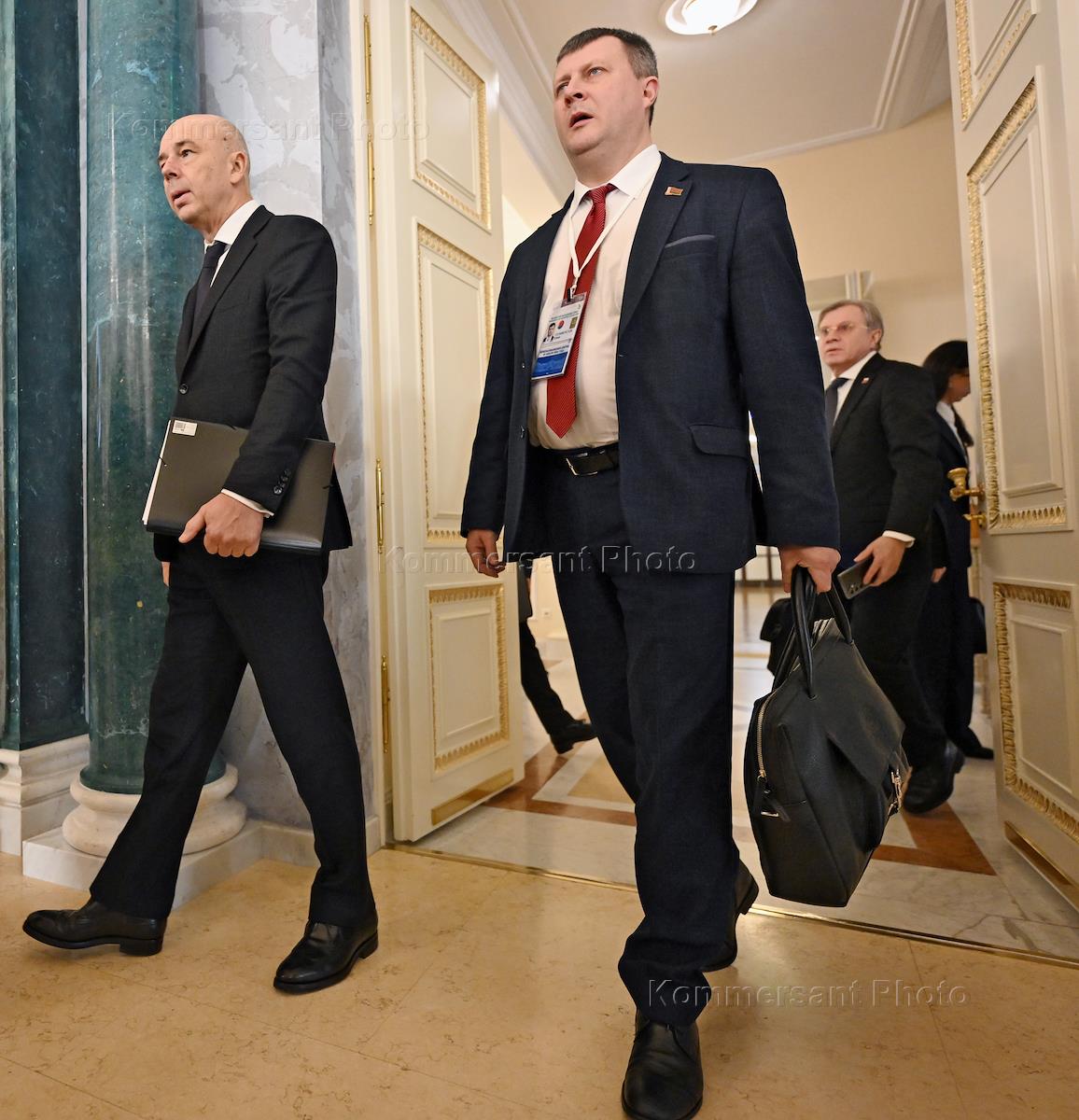 Рабочая поездка президента России Владимира Путина в Санкт-Петербург. Заседание Высшего Государственного Совета Союзного государства России и Белоруссии в Константиновском дворце. Министр финансов России Антон Силуанов (слева) и министр финансов Белоруссии Юрий Селиверстов (справа) перед началом заседания.