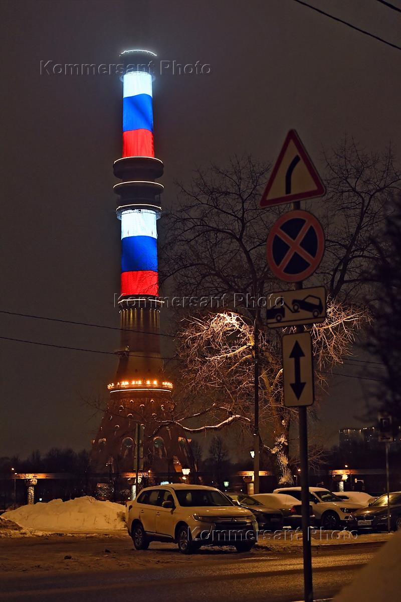 Виды вечерней Москвы. Останкинская башня в цветах государственного флага России. Жанровая фотография.