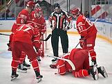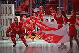 Континентальная хоккейная лига (КХЛ). Чемпионат сезона 2023/24. Матч между командами "Спартак" (Москва) - "Торпедо" (Нижний Новгород) на стадионе "Мегаспорт". Игроки команды "Спартак" перед началом матча.