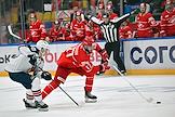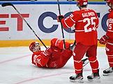 Континентальная хоккейная лига (КХЛ). Чемпионат сезона 2023/24. Матч между командами "Спартак" (Москва) - "Торпедо" (Нижний Новгород) на стадионе "Мегаспорт". Игрок команды "Торпедо" Андрей Белевич (слева) и игрок команды "Спартак" Дмитрий Вишневский (справа) во время матча.