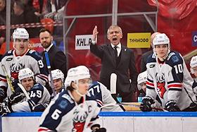 Континентальная хоккейная лига (КХЛ). Чемпионат сезона 2023/24. Матч между командами "Спартак" (Москва) - "Торпедо" (Нижний Новгород) на стадионе "Мегаспорт". Главный тренер команды "Спартак" Алексей Жамнов (в центре) во время матча.