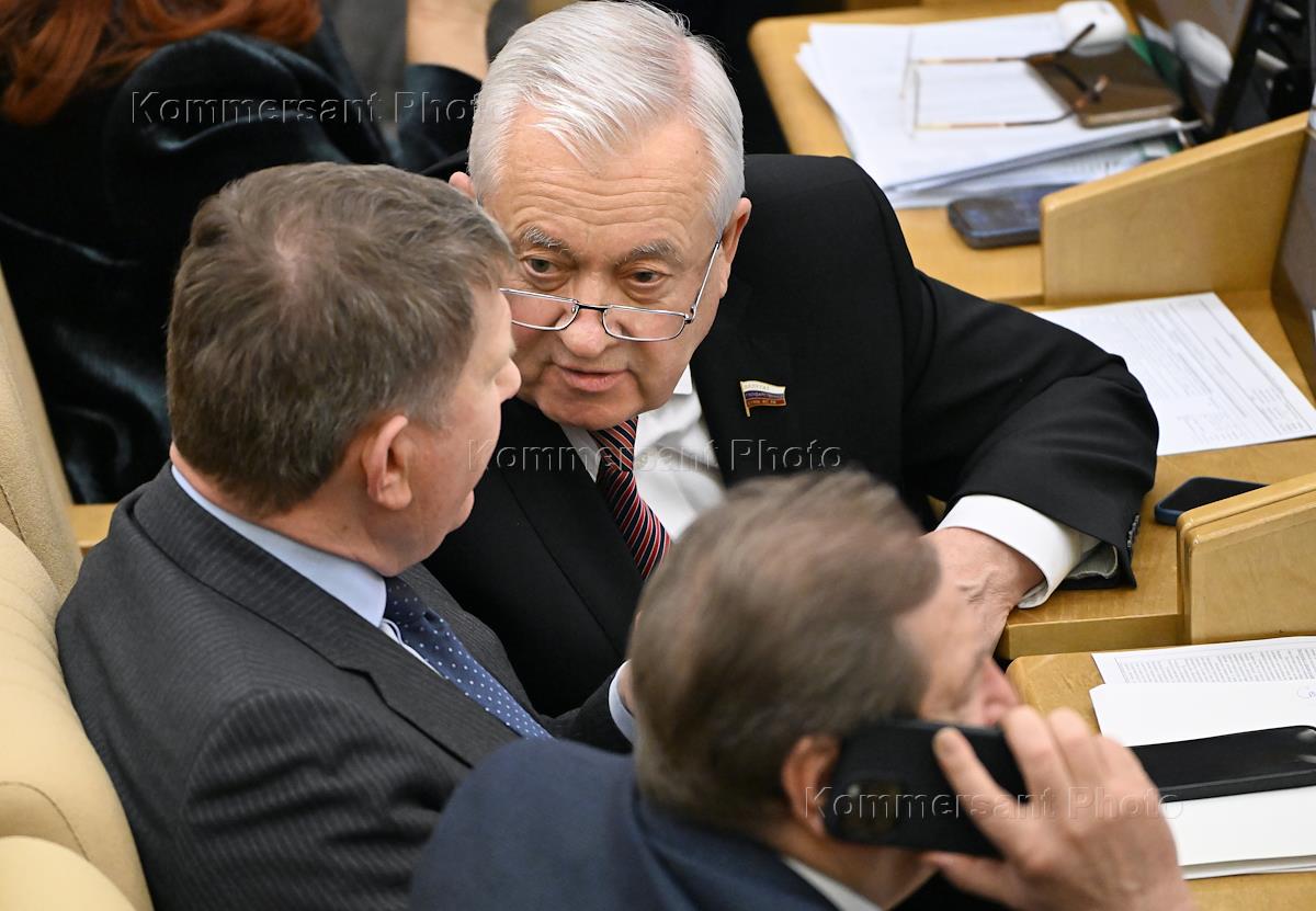 Пленарное заседание Государственной думы (ГД) России. Член комитета ГД России по контролю Леонид Ивлев (справа) во время заседания.