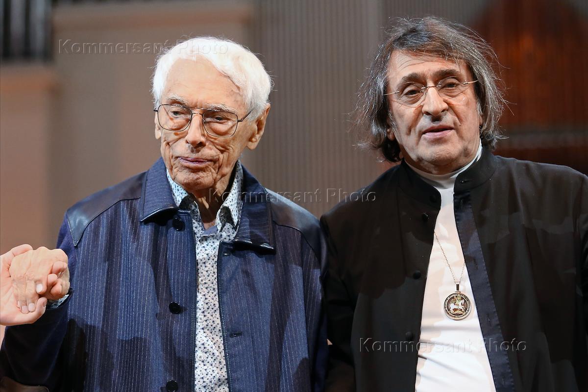 V Зимний международный фестиваль искусств Юрия Башмета на сцене Концертного зала имени П. И. Чайковского. Концерта "Есть только миг. Александр Зацепин" в рамках фестиваля. Композитор Александр Зацепин (слева) и художественный руководитель и главный дирижер Государственного симфонического оркестра "Новая Россия" Юрий Башмет (справа) на концерте.