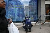 Виды Брюсселя перед саммитом Европейского Союза (ЕС). Жанровая фотография. Сотрудники полиции устанавливают дорожные знаки.