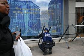 Виды Брюсселя перед саммитом Европейского Союза (ЕС). Жанровая фотография. Сотрудники полиции во время установки ограждений.