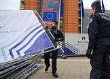 Виды Брюсселя перед саммитом Европейского Союза (ЕС). Жанровая фотография. Сотрудники полиции устанавливают ограждения.