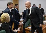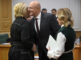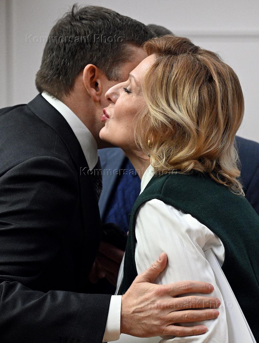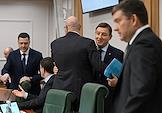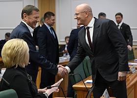 Заседание совета по развитию цифровой экономики на тему: "Россия на связи: развитие инфраструктуры связи в субъектах Российской Федерации" в Совете Федерации (СФ) России. Заместители председателя СФ России Николай Журавлев (слева) и Инна Святенко (справа) во время заседания.