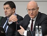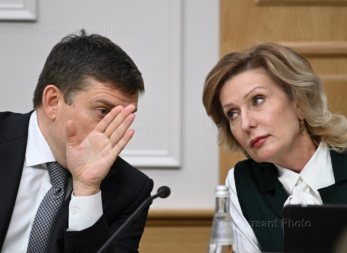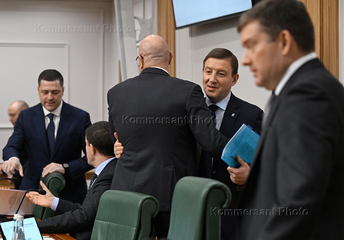 Заседание совета по развитию цифровой экономики на тему: "Россия на связи: развитие инфраструктуры связи в субъектах Российской Федерации" в Совете Федерации (СФ) России. Заместитель председателя правительства России Дмитрий Чернышенко (справа) во время заседания.