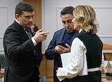 Заседание совета по развитию цифровой экономики на тему: "Россия на связи: развитие инфраструктуры связи в субъектах Российской Федерации" в Совете Федерации (СФ) России. Слева направо: председатель комитета Государственной думы России по транспорту и развитию транспортной инфраструктуры Евгений Москвичев, первый заместитель председателя СФ России, секретарь Генсовета партии "Единая Россия" Андрей Турчак и представитель в СФ России от законодательного (представительного) органа государственной власти Ростовской области Ирина Рукавишникова во время заседания.