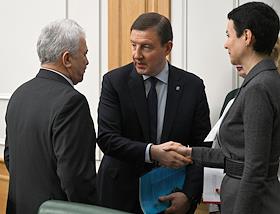 Заседание совета по развитию цифровой экономики на тему: "Россия на связи: развитие инфраструктуры связи в субъектах Российской Федерации" в Совете Федерации (СФ) России. Заместитель председателя СФ России Николай Журавлев, представитель в СФ России от исполнительного органа государственной власти Кировской области Вячеслав Тимченко и заместитель председателя СФ России Инна Святенко во время заседания.