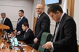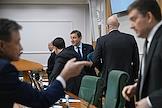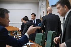 Заседание совета по развитию цифровой экономики на тему: "Россия на связи: развитие инфраструктуры связи в субъектах Российской Федерации" в Совете Федерации (СФ) России. Заместитель председателя правительства России Дмитрий Чернышенко (второй справа) во время заседания.