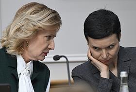 Заседание совета по развитию цифровой экономики на тему: "Россия на связи: развитие инфраструктуры связи в субъектах Российской Федерации" в Совете Федерации (СФ) России. Представитель в СФ России от законодательного (представительного) органа государственной власти Ростовской области Ирина Рукавишникова (справа) и заместитель председателя СФ России Инна Святенко (слева) во время заседания.