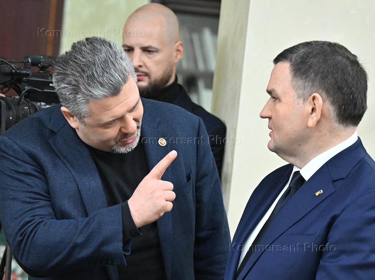 Церемония подписания соглашения с политическими партиями о сотрудничестве и взаимодействии в наблюдении за выборами Президента России, которые состоятся 17 марта 2024года, в Общественной палате России. Директор Фонда исследования проблем демократии, член Общественной палаты России Максим Григорьев (слева) и заместитель секретаря генерального совета партии "Единая Россия", представитель от исполнительного органа государственной власти Ленинградской области Сергей Перминов (справа) перед началом церемонии.