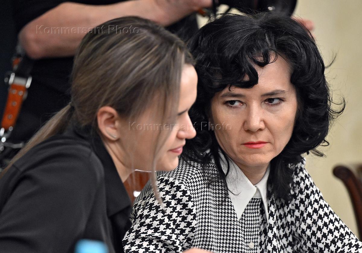 Церемония подписания соглашения с политическими партиями о сотрудничестве и взаимодействии в наблюдении за выборами Президента России, которые состоятся 17 марта 2024года, в Общественной палате России. Секретарь Общественной палаты России, председатель совета (руководитель) ФГБНУ "Исследовательский центр частного права имени С. С. Алексеева при президенте РФ" Лидия Михеева (справа) и член Общественной палаты России, исполнительный директор ассоциации "Независимый общественный мониторинг" (НОМ) Алена Булгакова (слева) во время церемонии.