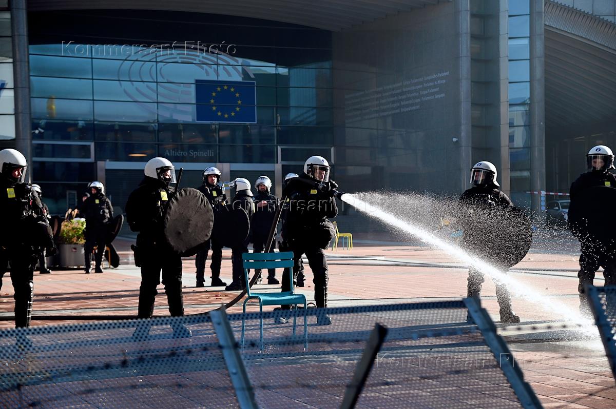 Акция фермеров против общей сельскохозяйственной политики Евросоюза в евроквартале Брюсселя, где проходит экстренный саммит лидеров 27 стран Евросоюза по выделению помощи Украине в размере €50 млрд на четыре года. Сотрудники полиции во время акции.