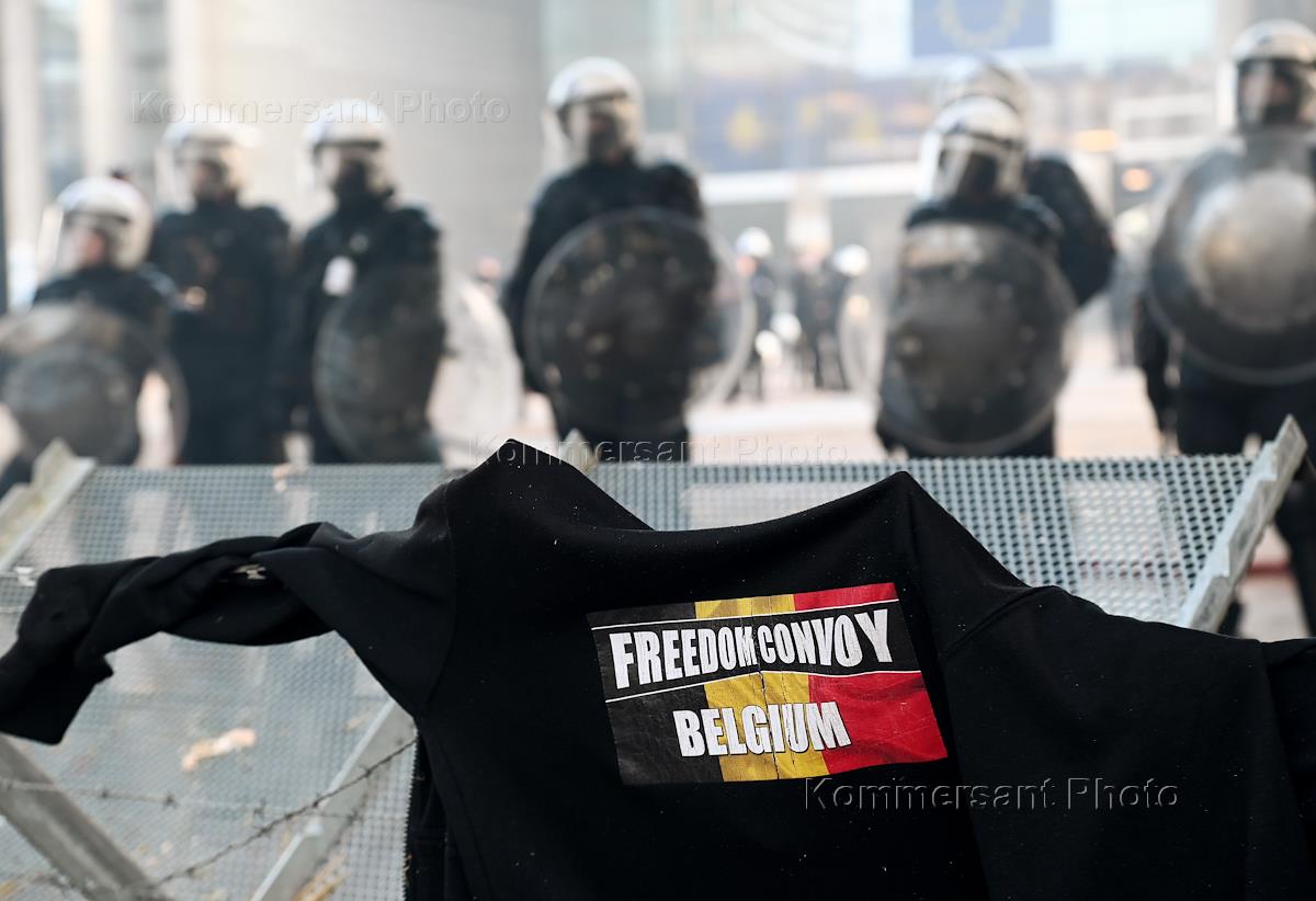 Акция фермеров против общей сельскохозяйственной политики Евросоюза в евроквартале Брюсселя, где проходит экстренный саммит лидеров 27 стран Евросоюза по выделению помощи Украине в размере €50 млрд на четыре года. Сотрудники полиции в оцеплении во время акции.