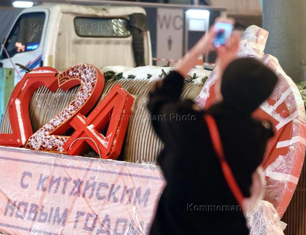 Виды Москвы. Оформление улиц в преддверии Китайского нового года. Несобранная световая конструкция перед установкой. Жанровая фотография.