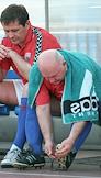 Министр внутренних дел России Борис Грызлов (справа) на матче по футболу между командами депутатов Государственной Думы России и Бундестага Германии. Матч состоялся на стадионе "Динамо".