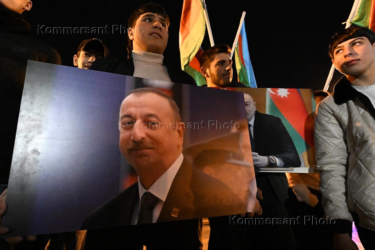 Внеочередные выборы президента Азербайджана. Люди в центре Баку во время празднования победы Ильхама Алиева на выборах. За Ильхама Алиева проголосовали 93,9 процента избирателей. Президентские выборы в Азербайджане должны были состояться в 2025 году, но были перенесены в связи с изменением статуса Нагорного Карабаха, который многие годы не был подконтрольным Баку.
