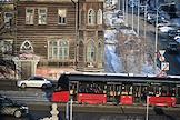 Жанровая фотография. Виды города Барнаул. Старинный деревянный дом и трамвай городского общественного транспорта.