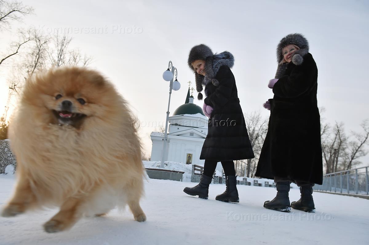 Жанровая фотография. Виды города Барнаул. Люди гуляют с собакой.