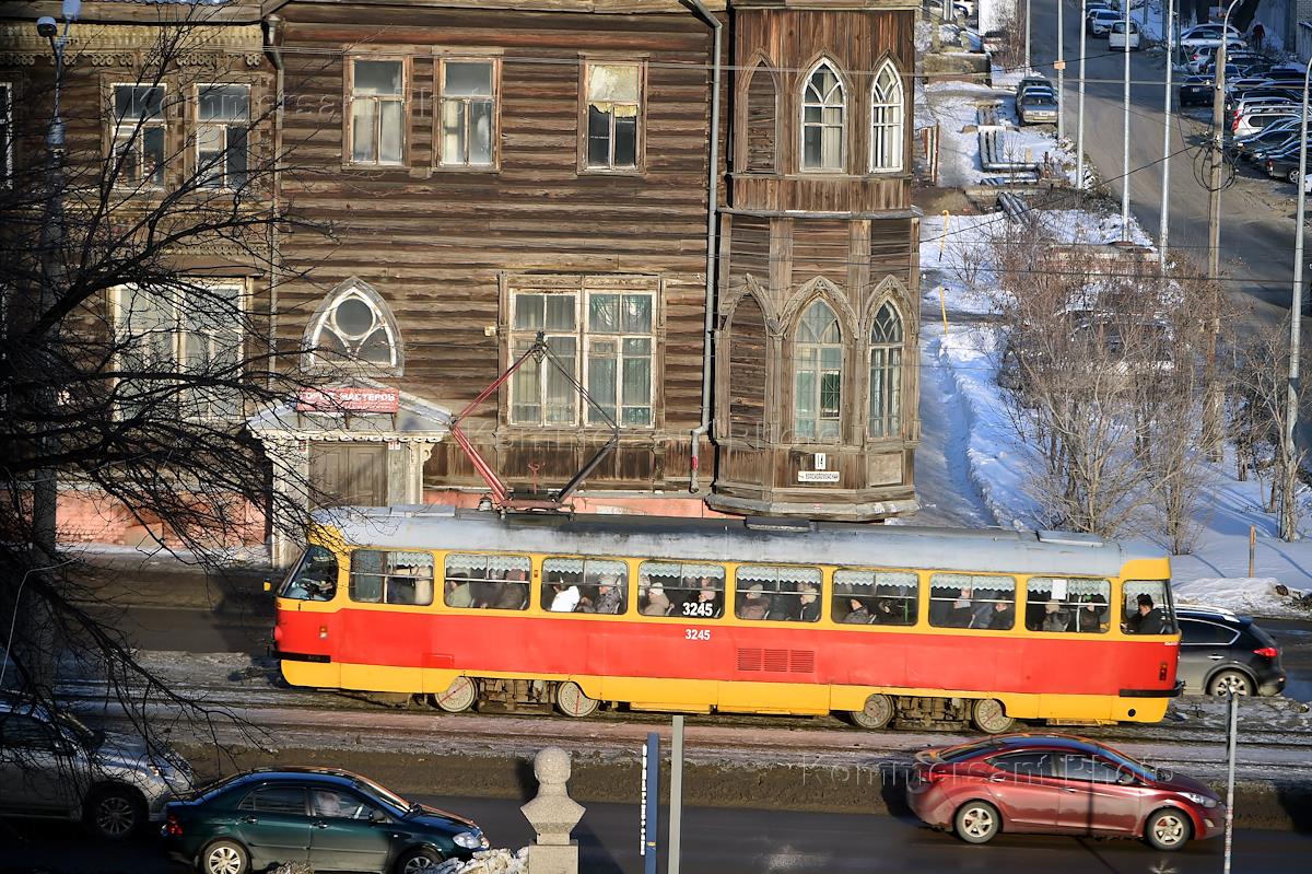 Жанровая фотография. Виды города Барнаул. Старинный деревянный дом и трамвай городского общественного транспорта.