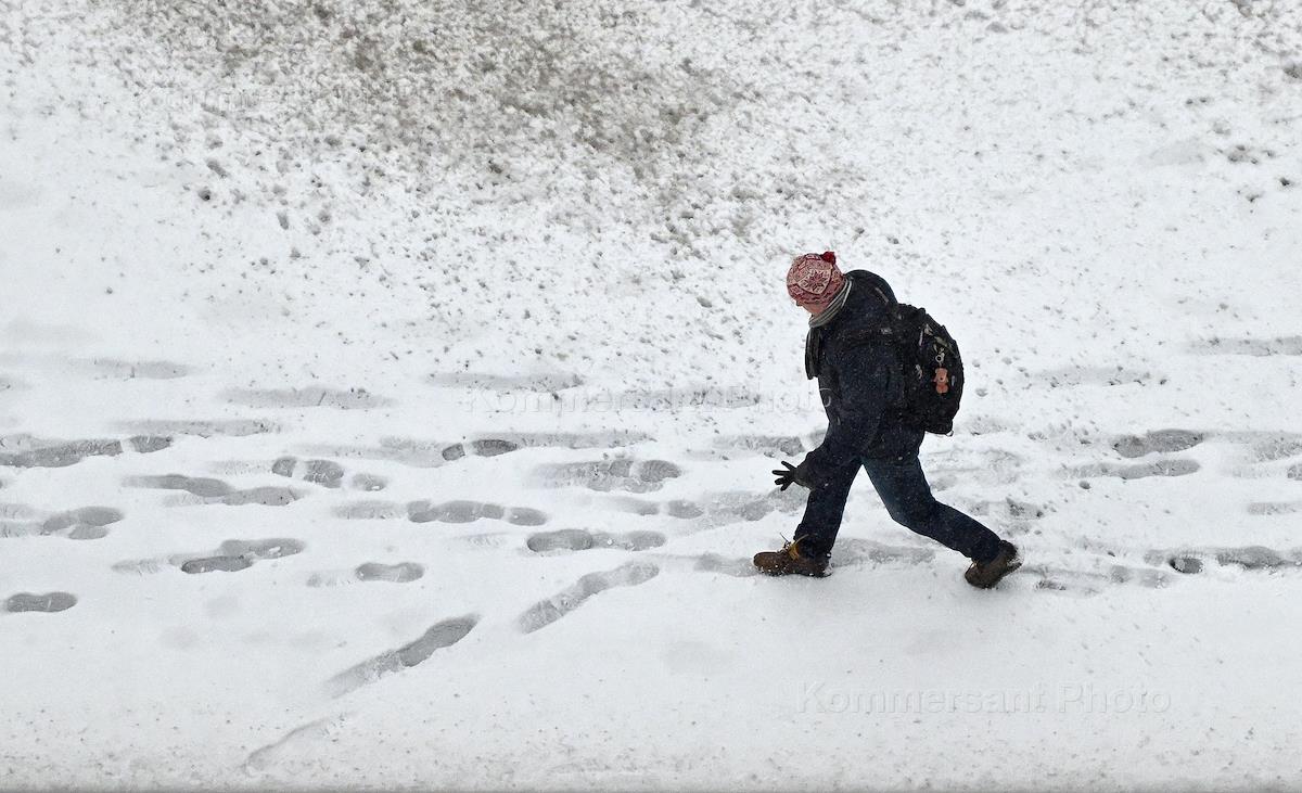Genre photography. Snowfall in the city. A young man walks under the snow.