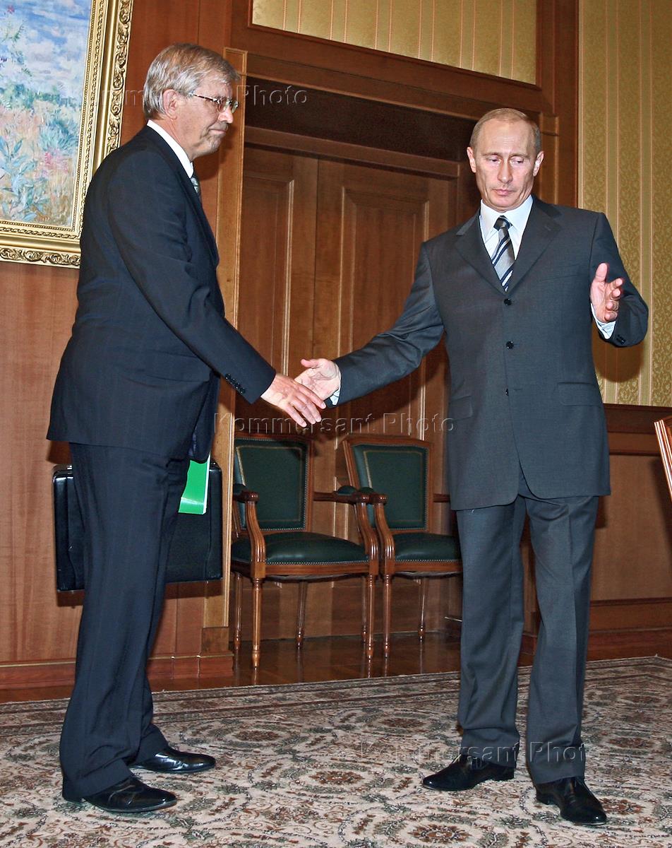 Президент России Владимир Путин (справа) и председатель Центрального Банка России Сергей Игнатьев (слева) во время встречи в президентской резиденции "Бочаров ручей".