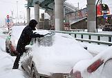 Виды Москвы после снегопада. Жанровая фотография. Водитель отчищает автомобиль от снега.