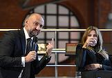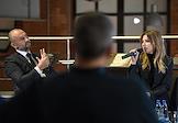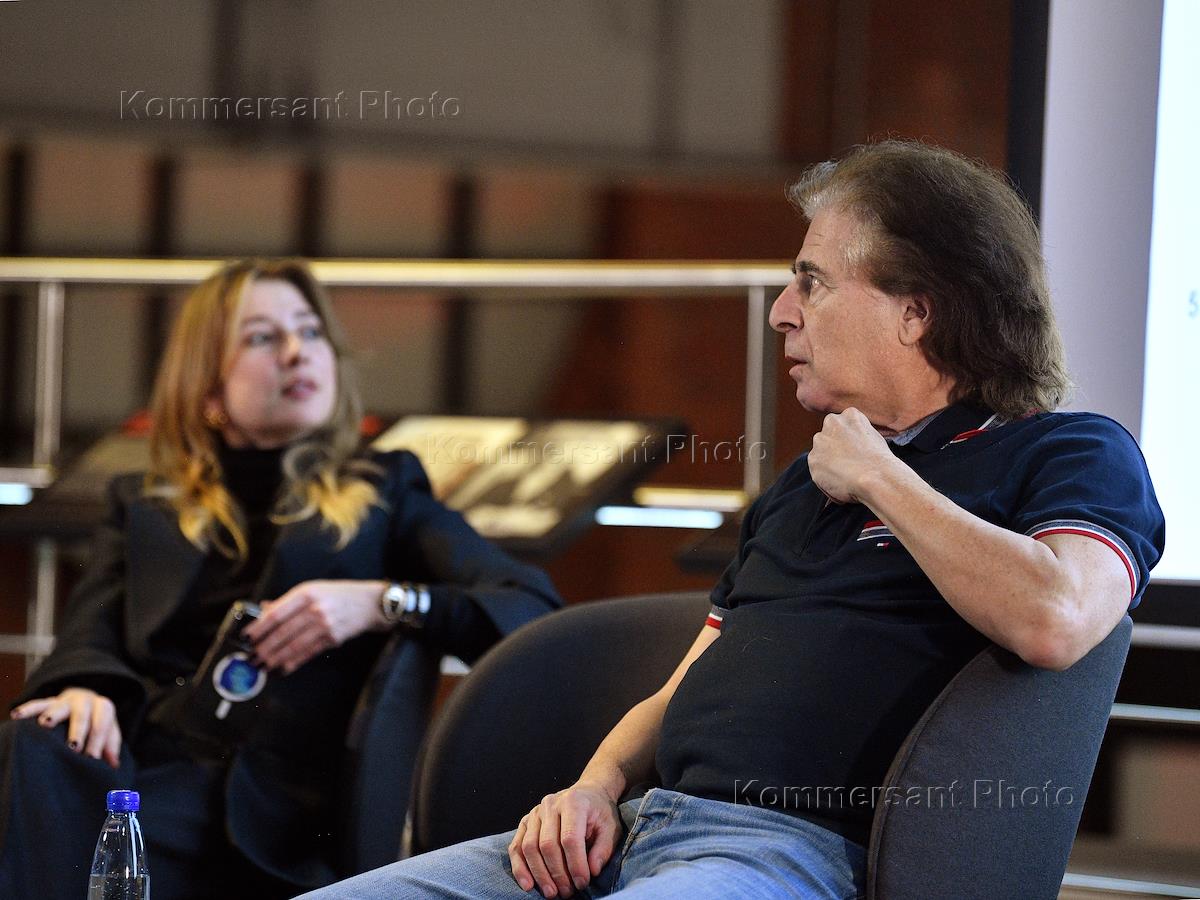 Закрытая дискуссия "Жизнь после жизни" в Еврейском музее и центре толерантности. Коллекционер, управляющий партнер аудиторско-консалтинговой группы "Прайм Эдвайс" Денис Химиляйне (слева) и исполнительный директор Еврейского музея и центра толерантности Кристина Краснянская (справа) во время дискуссии.