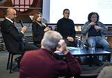 Закрытая дискуссия "Жизнь после жизни" в Еврейском музее и центре толерантности. Слева направо: коллекционер, управляющий партнер аудиторско-консалтинговой группы "Прайм Эдвайс" Денис Химиляйне, исполнительный директор Еврейского музея и центра толерантности Кристина Краснянская, коллекционер Алексей Лукин и фотограф Александр Бородулин во время дискуссии.
