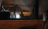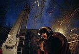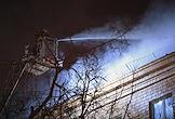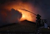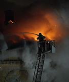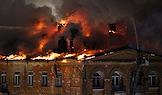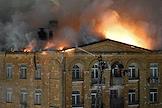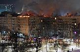 Пожар в шестиэтажном жилом доме на улице Черняховского возле метро "Аэропорт". Площадь пожара кровли здания составила 4 тысячи квадратных метров. Сотрудники пожарной службы МЧС во время тушения пожара.