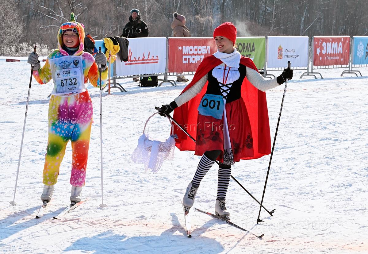 Всероссийская массовая лыжная гонка "Лыжня России 2024" в микрорайоне "Планерный" в городе Химки. Участник гонки на финише.