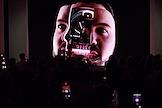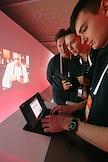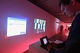 Презентация от компании "Яндекс" обновления "Яндекс Браузер" в Лофт Quattro Space. Жанровая фотография. Надпись "Нарисуй групповое фото" на экране во время презентации.