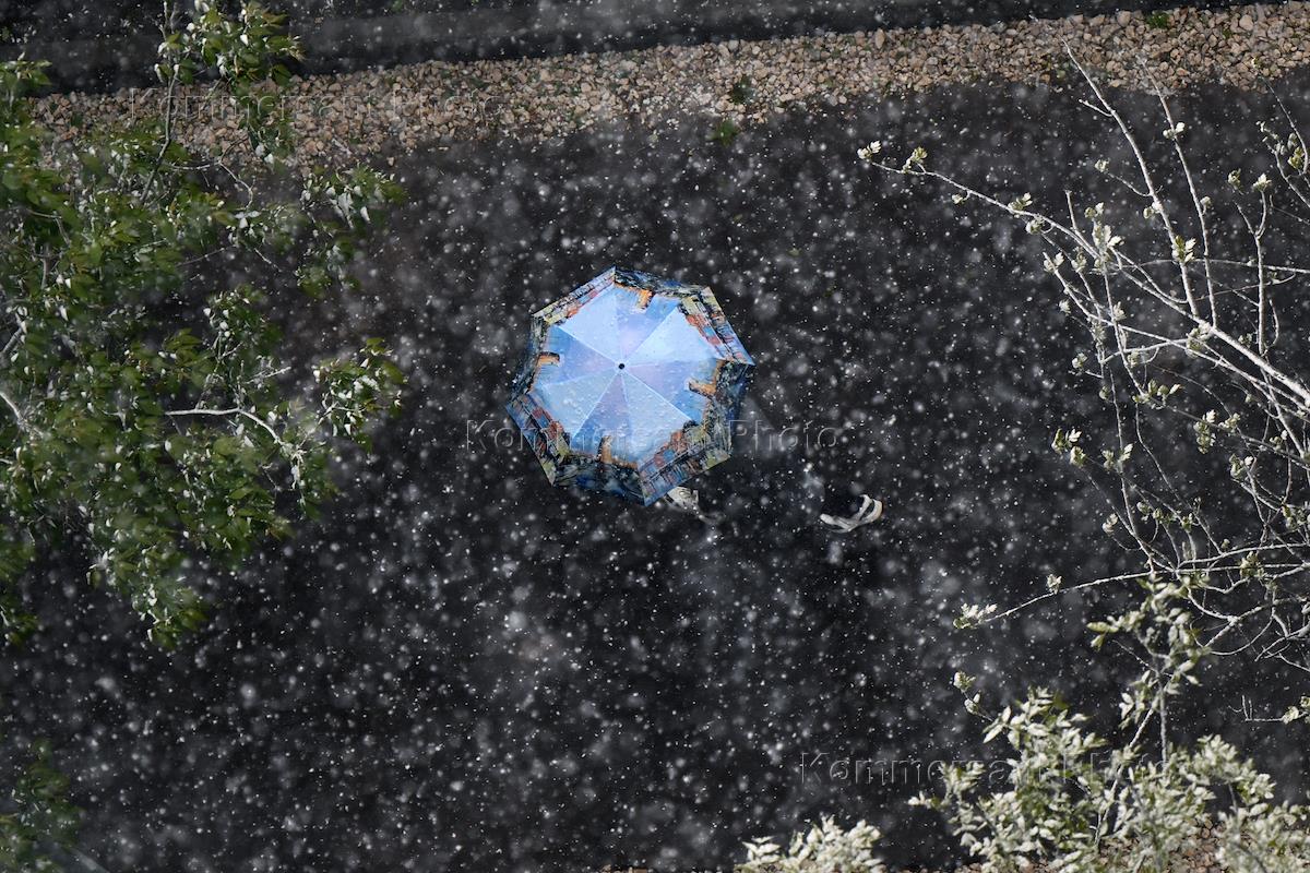 Снегопад в Москве. Жанровая фотография. Женщина под зонтом во дворе жилого дома во время снегопада.