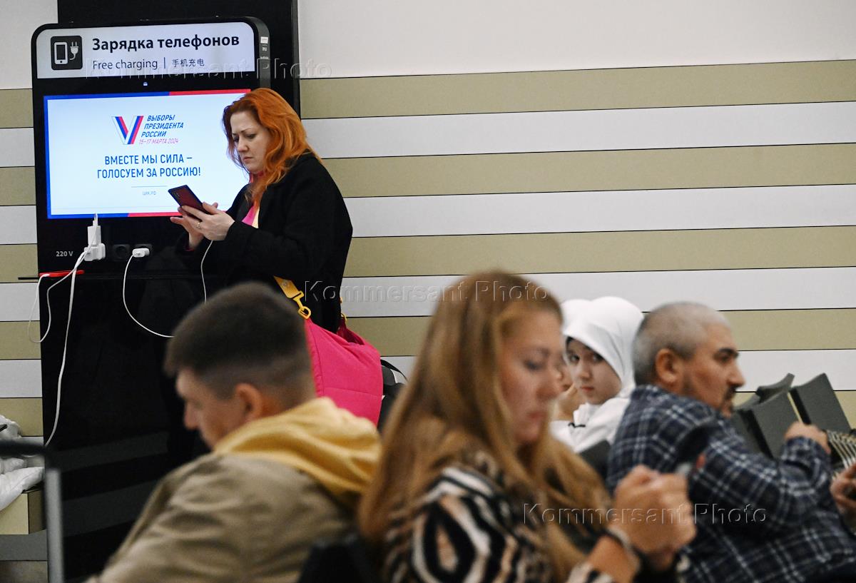 Genre photography. Election propaganda for the Russian presidential elections on March 15-17, 2024 on the screen in the airport building.