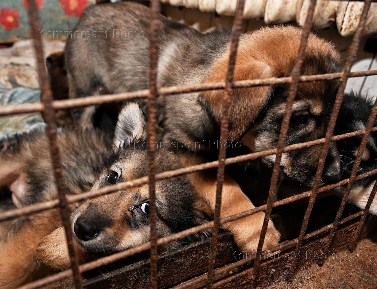 Genre photography. Puppies in a cage.