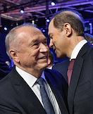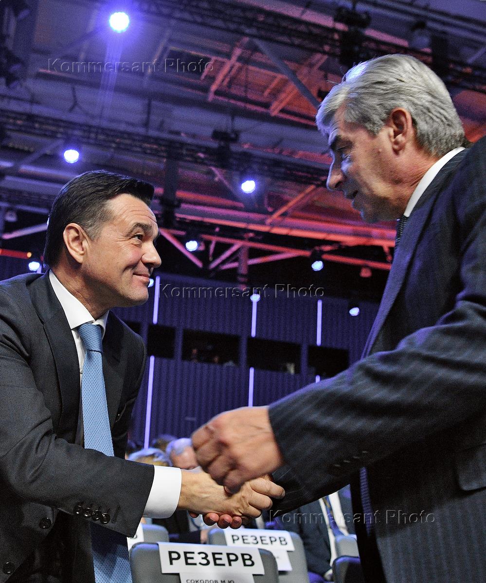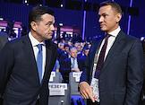 "День промышленности" в рамках Международной выставки-форума "Россия" на ВДНХ. Пленарная сессия "О ключевых достижениях и результатах развития промышленности. Итоговая коллегия". Губернатор Московской области Андрей Воробьев (слева) и руководитель Федеральной службы по экологическому, технологическому и атомному надзору (Ростехнадзор) Александр Трембицкий (справа) на сессии.