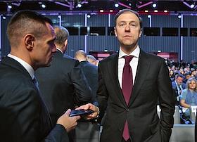 "День промышленности" в рамках Международной выставки-форума "Россия" на ВДНХ. Пленарная сессия "О ключевых достижениях и результатах развития промышленности. Итоговая коллегия". Заместитель председателя правительства России - министр промышленности и торговли России Денис Мантуров (справа) на сессии.