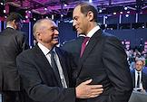 "День промышленности" в рамках Международной выставки-форума "Россия" на ВДНХ. Пленарная сессия "О ключевых достижениях и результатах развития промышленности. Итоговая коллегия". Президент торгово-промышленной палаты (ТПП) России Сергей Катырин (слева) и заместитель председателя правительства России - министр промышленности и торговли России Денис Мантуров (справа) на сессии.