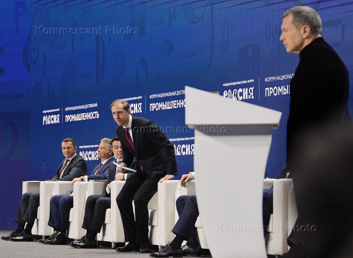 "День промышленности" в рамках Международной выставки-форума "Россия" на ВДНХ. Пленарная сессия "О ключевых достижениях и результатах развития промышленности. Итоговая коллегия". Телеведущий Владимир Соловьев на сессии.