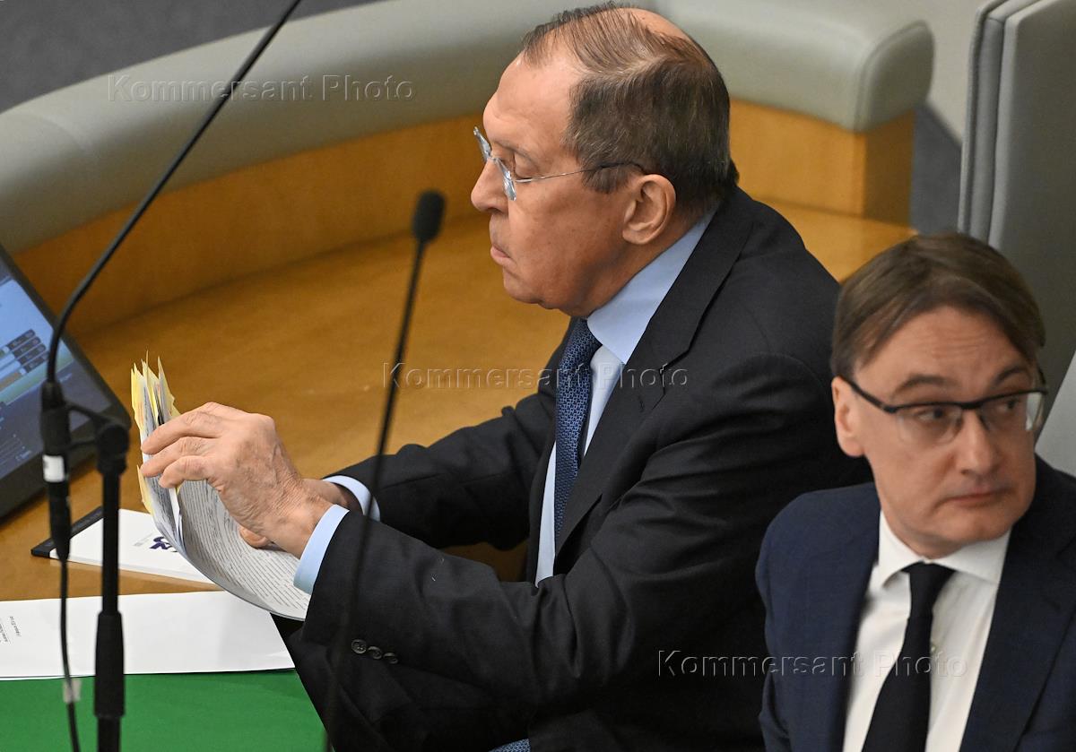 Пленарное заседание Государственной думы (ГД) России. Министр иностранных дел России Сергей Лавров (в центре) во время выступления на заседании.