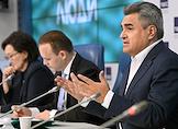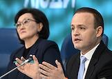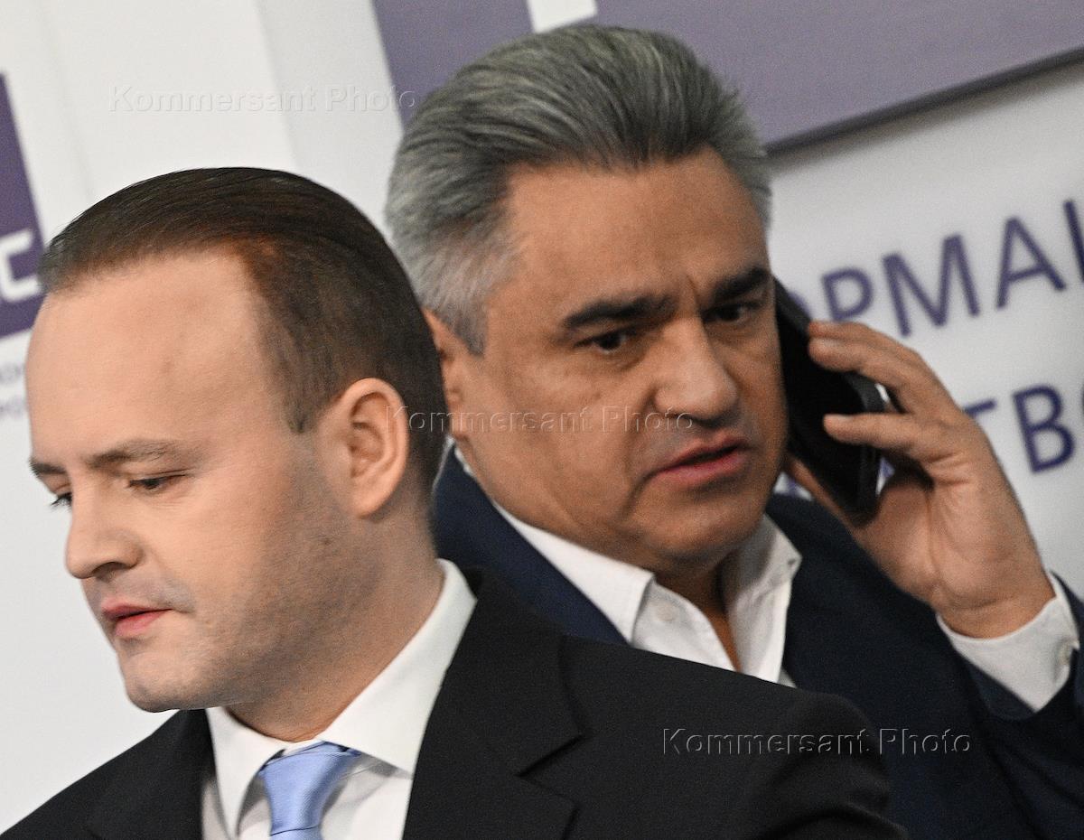 Пресс-конференция, посвященная представлению программы единого кандидата на должность президента России от партии "Новые люди" и "Партии роста" Владислава Даванкова, в пресс-центре ТАСС. Заместитель председателя комитета Государственной думе (ГД) России по государственному строительству и законодательству Сардана Авксентьева (слева) и кандидат на должность президента России Владислав Даванков (справа) во время пресс-конференции.