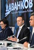 Пресс-конференция, посвященная представлению программы единого кандидата на должность президента России от партии "Новые люди" и "Партии роста" Владислава Даванкова, в пресс-центре ТАСС. Слева направо: заместитель председателя комитета Государственной думе (ГД) России по государственному строительству и законодательству Сардана Авксентьева, кандидат на должность президента России Владислав Даванков и руководитель фракции партии "Новые люди" в ГД России Алексей Нечаев во время пресс-конференции.