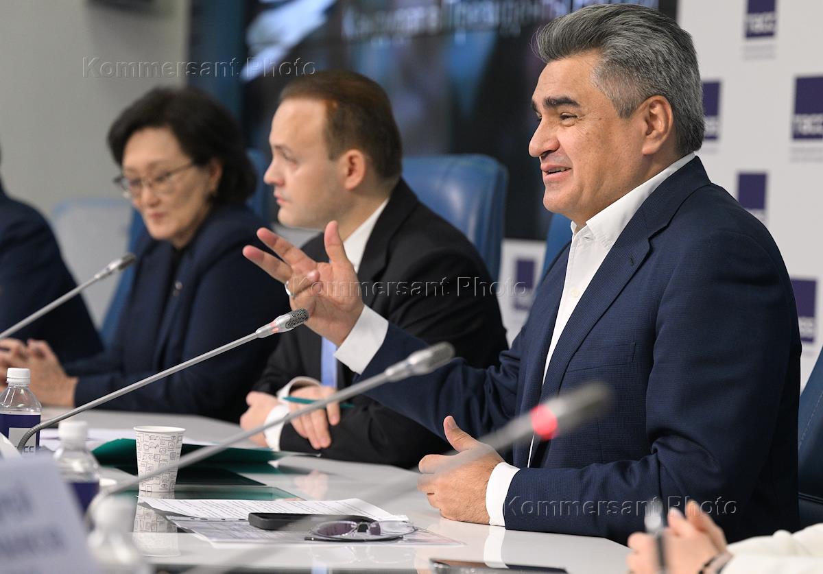 Пресс-конференция, посвященная представлению программы единого кандидата на должность президента России от партии "Новые люди" и "Партии роста" Владислава Даванкова, в пресс-центре ТАСС. Слева направо: заместитель председателя комитета Государственной думе (ГД) России по государственному строительству и законодательству Сардана Авксентьева, кандидат на должность президента России Владислав Даванков и руководитель фракции партии "Новые люди" в ГД России Алексей Нечаев во время пресс-конференции.