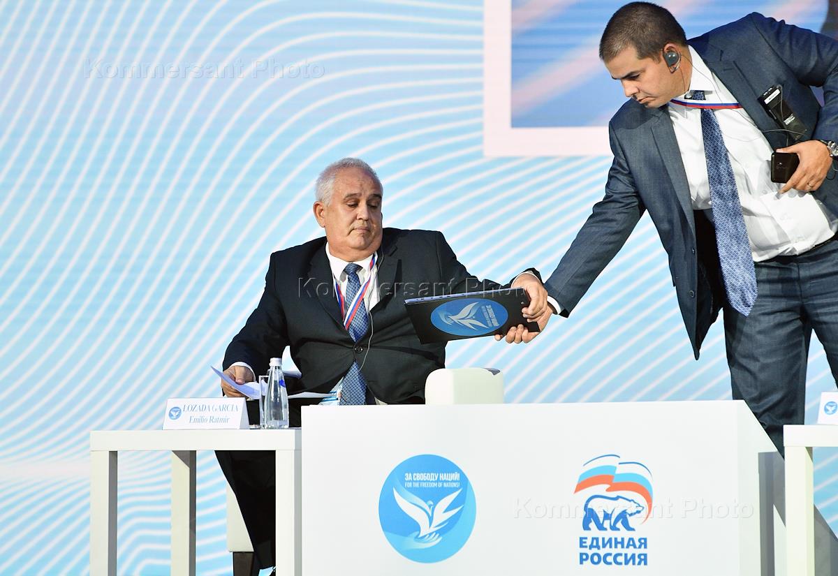 Учредительный форум неформального международного движения "Форум сторонников борьбы с современными практиками неоколониализма" – "За свободу наций!", организованный партией "Единая Россия" в Доме Союзов. Заведующий международным отделом ЦК Коммунистической партии Кубы, член комиссии по международным связям Национальной ассамблеи народной власти (однопалатный парламент) Кубы Эмилио Лосада Гарсия (слева) на форуме.